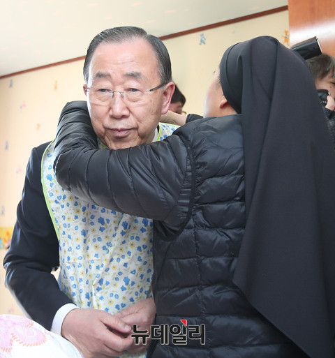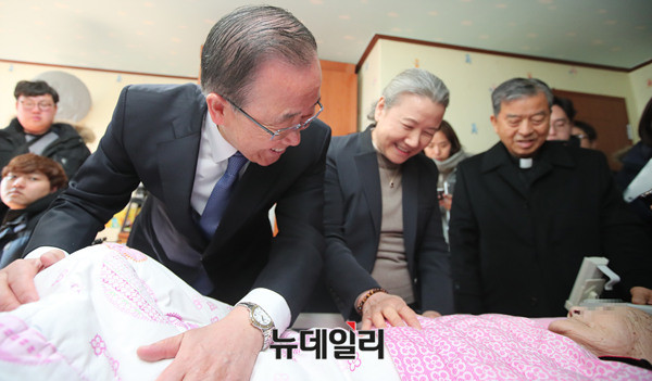반기문 전 유엔사무총장이 14일 오후 충북 음성군 맹동면에 위치한 사회복지시설 꽃동네를 찾아 요양 중인 할머니에게 죽을 떠 먹여드리고 있다. (왼쪽부터 반 전 총장, 부인 유순택 여사, 오웅진 신부, 윤숙자 시몬 수녀)