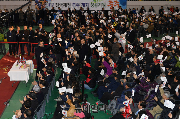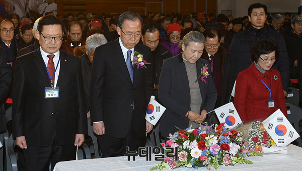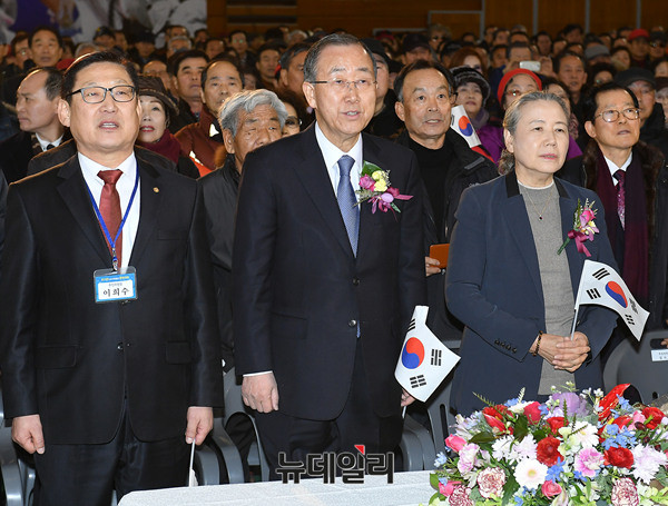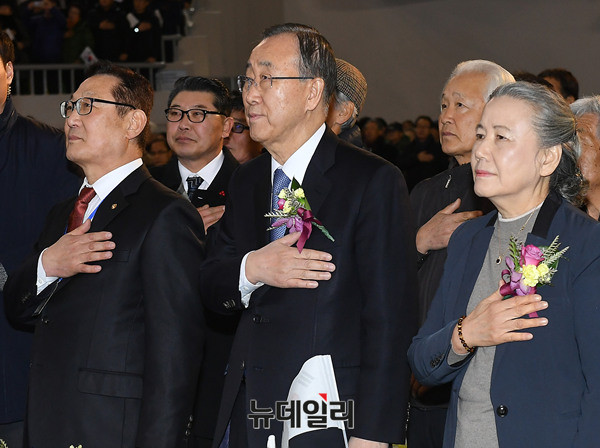 반기문 전 유엔사무총장이 14일 오후 충북 충주체육관에서 열린 충주시민환영대회에 참석해 국민의례를 하고 있다. 이날 모인 시민들은 태극기를 흔들며 반 전 총장을 환영했다. (충북 충주=뉴데일리 정상윤 기자)