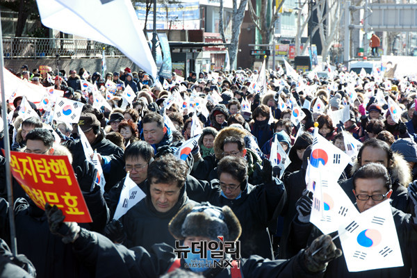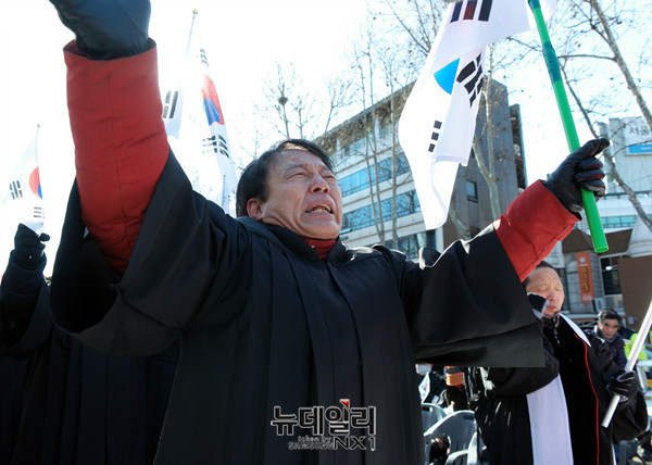 평강제일교회 연합성가대와 목회자들이 14일 오후 서울 종로구 대학로 일대에서 '탄핵기각을 위한 국민총궐기 운동본부(탄기국)' 주최로 열린 제9차 태극기 집회에서 기도를 하고 있다.