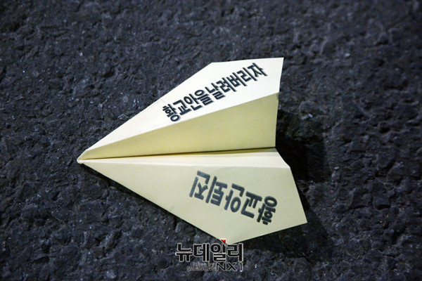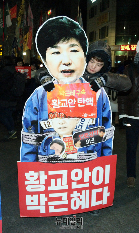 박근혜 대통령 퇴진을 촉구하는 떼촛불집회가 14일 오후 서울 광화문광장에서 열린 가운데 집회 참가자가 황교안 국무총리 퇴진을 촉구하는 발언을 하고 있다. 이날 집회 참가자들은 청와대로 행진하며 정부서울청사 건물을 향해 '황교안 퇴진', '황교안을 날려버리자'라고 적은 종이비행기를 날리는 퍼포먼스도 벌였다.