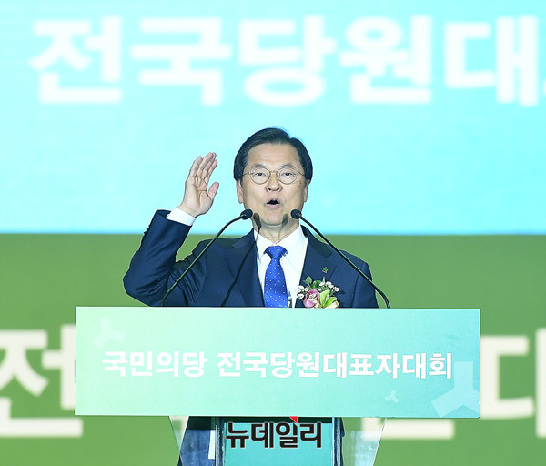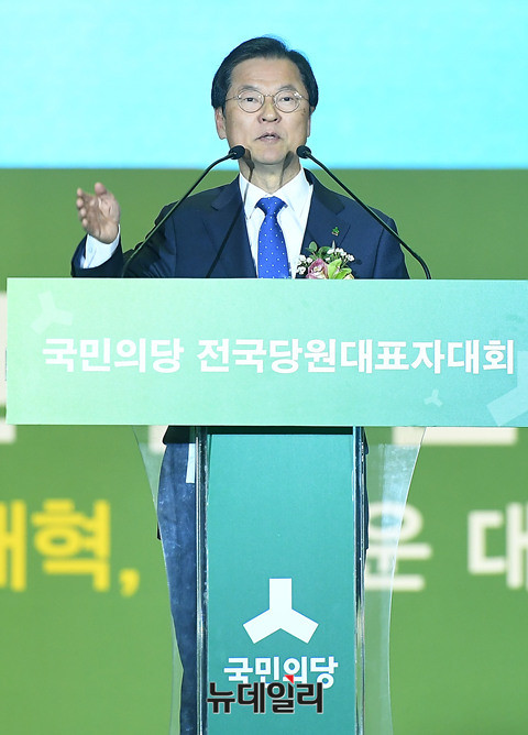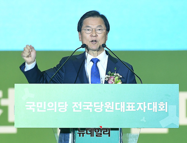 천정배 전 국민의당 공동대표가 15일 오후 경기 고양시 일산서구 킨텍스 제1전시장 3홀에서 당대표 및 최고위원, 전국여성위원장, 전국청년위원장을 선출하는 전국당원대표자대회에서 격려사를 하고 있다.