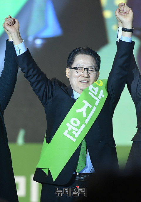 박지원 국민의당 당대표 및 최고위원 후보가 15일 오후 경기 고양시 일산서구 킨텍스 제1전시장 3홀에서 당대표 및 최고위원, 전국여성위원장, 전국청년위원장을 선출하는 전국당원대표자대회에서 신임 당대표로 선출된 후 손을 흔들어 화답하고 있다.