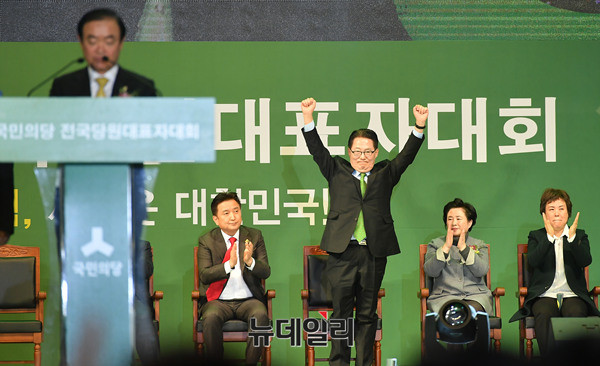 박지원 국민의당 당대표 및 최고위원 후보가 15일 오후 경기 고양시 일산서구 킨텍스 제1전시장 3홀에서 당대표 및 최고위원, 전국여성위원장, 전국청년위원장을 선출하는 전국당원대표자대회에서 신임 당대표로 선출된 후 손을 흔들어 화답하고 있다.
