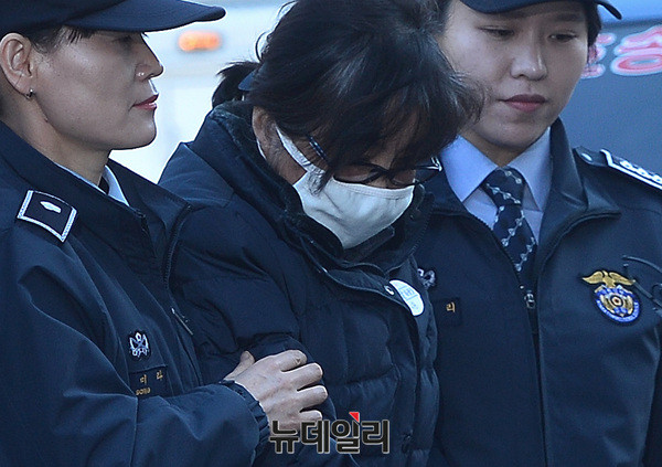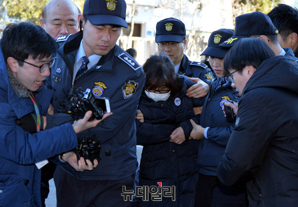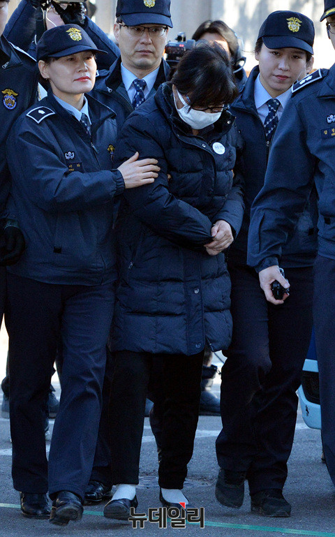 비선실세 의혹을 받고 있는 최순실 씨가 16일 오전 서울 종로구 헌법재판소 대심판정에서 열린 '박근혜대통령 탄핵심판사건 5차변론'에 고개를 숙인 체 증인으로 출석하고 있다.