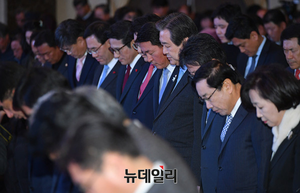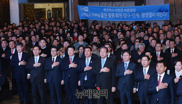 바른정당 지도부가 16일 오후 강원 원주시 아모르컨벤션에서 열린 바른정당 강원도당 창당대회에서 국민의례를 하고 있다. 권성동, 황영철 의원은 이날 창당대회에서 강원도당 공동위원장으로 선출됐다.