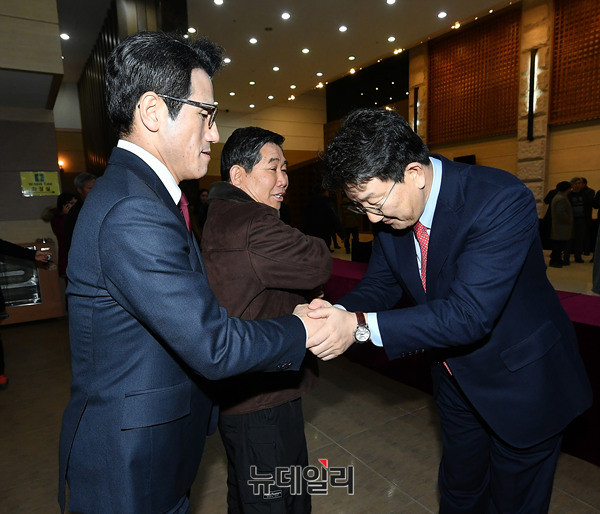 정병국 바른정당 중앙당창당준비위원장이 16일 오후 강원 원주시 아모르컨벤션에서 열린 바른정당 강원도당 창당대회에 입장하며 권성동 의원과 악수를 나누고 있다. 권성동, 황영철 의원은 이날 창당대회에서 강원도당 공동위원장으로 선출됐다.