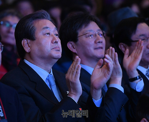 김무성, 유승민 바른정당 의원이 16일 오후 강원 원주시 아모르컨벤션에서 열린 바른정당 강원도당 창당대회에서 박수를 치고 있다. 강원도가 지역구인 권성동, 황영철 의원은 이날 창당대회에서 강원도당 공동위원장으로 선출됐다.