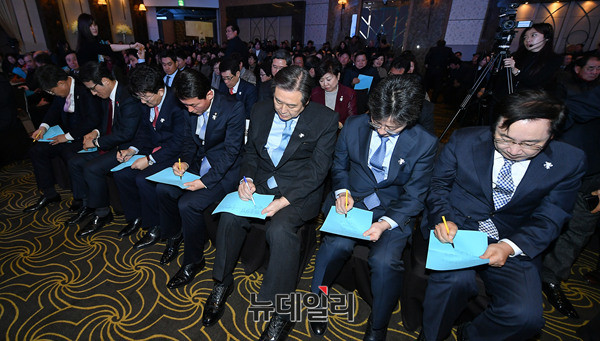바른정당 지도부와 창당대회 참석자들이 16일 오후 강원 원주시 아모르컨벤션에서 열린 바른정당 강원도당 창당대회에서 종이에 소망을 적고 있다. 강원도가 지역구인 권성동, 황영철 의원은 이날 창당대회에서 강원도당 공동위원장으로 선출됐다.