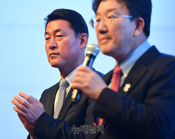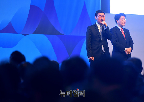 권성동, 황영철 바른정당 의원이 16일 오후 강원 원주시 아모르컨벤션에서 열린 바른정당 강원도당 창당대회에서 강원도당 공동위원장으로 추대된 후 수락연설을 하고 있다.
