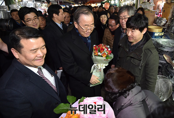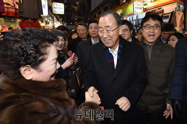 반기문 전 유엔 사무총장이 16일 오후 부산 중구 국제시장을 방문해 시민들과 인사를 나누고 있다.