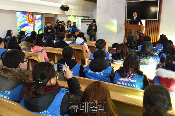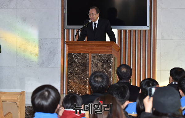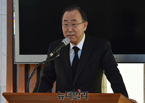 반기문 전 유엔 사무총장이 16일 부산 남구 대연동 유엔 기념공원을 찾아 6.25전쟁 참전 유엔군 묘역에 참배하고 자원 봉사들과 간담회를 갖고 있다. (부산=뉴데일리 이종현 기자)