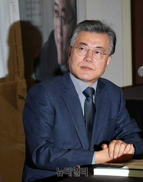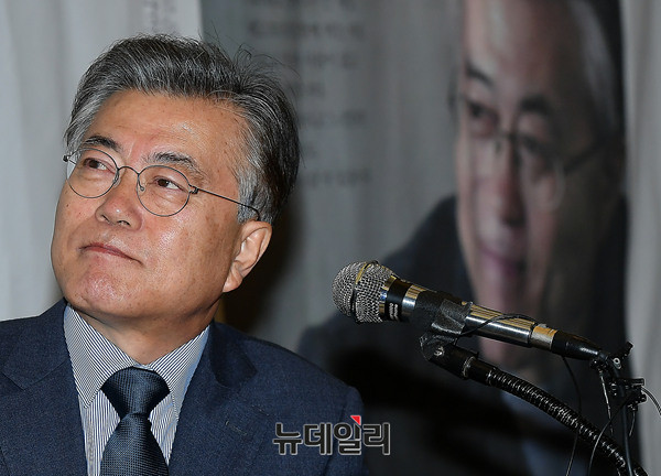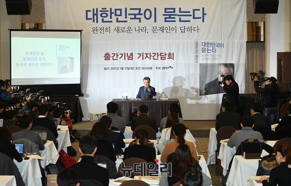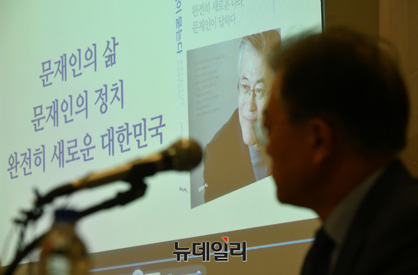 문재인 전 더불어민주당 대표가 17일 오전 한국프레스센터에서 열린 '대한민국이 묻는다' 출간기념 기자간담회에 앞서 동영상을 시청하고 있다.