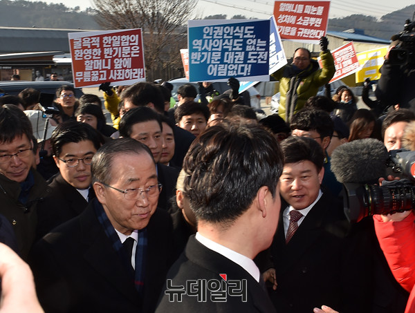문재인 전 대표의 지지자들은 "민족의 반역자 반기문은 떠나라", "친일파 반기문", "노무현 대통령에 부끄럽지 않으냐" 등등을 외쳤다.