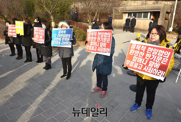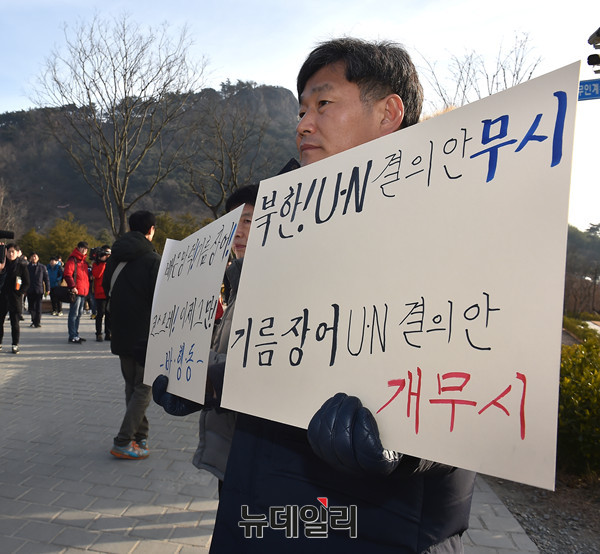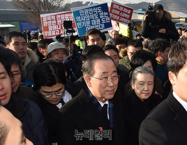 노무현을사랑하는사람들의모임(노사모) 회원들이 17일 오전 김해 봉하마을에서 고 노무현 전 대통령 묘역을 참배하러 온 반기문 전 유엔 사무총장을 규탄하고 있다. (경남 김해=뉴데일리 이종현 기자)
