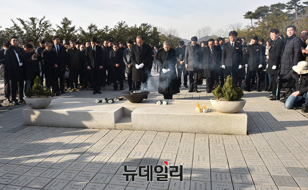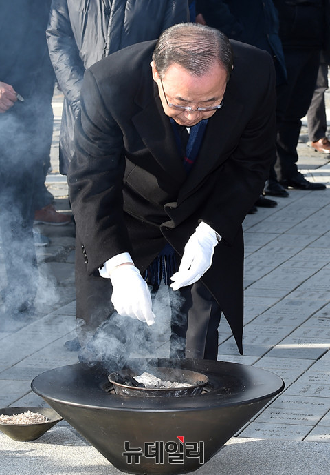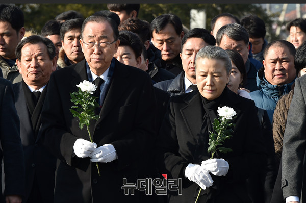 반기문 전 유엔 사무총장 내외가 17일 오전 김해 봉하마을을 찾아 고 노무현 전 대통령 묘역에 참배하고 있다. 반 전 사무총장은 이날 오후 진도 팽목항을 찾을 예정이다. (경남 김해=뉴데일리 이종현 기자)