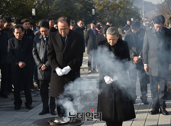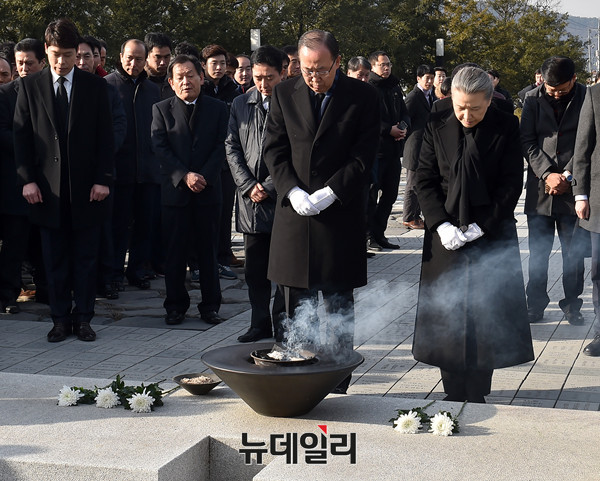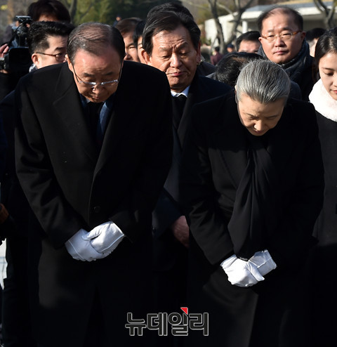 반기문 전 유엔 사무총장 내외가 17일 오전 김해 봉하마을을 찾아 고 노무현 전 대통령 묘역 앞에서 묵념하고 있다. 반 전 사무총장은 이날 오후 진도 팽목항을 찾을 예정이다. (경남 김해=뉴데일리 이종현 기자)