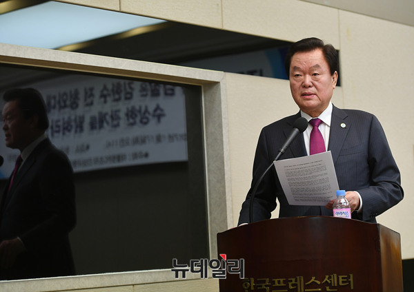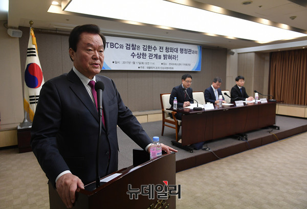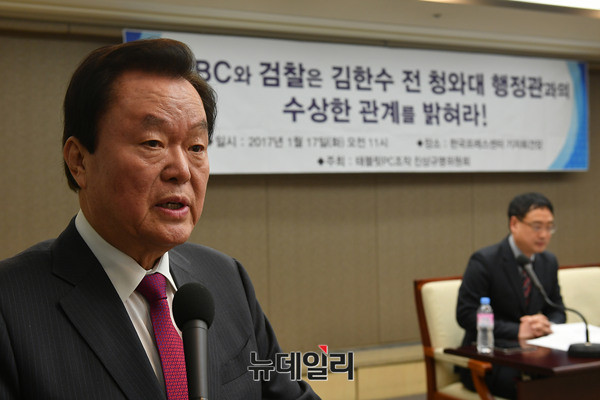 김경재 한국자유총연맹 중앙회장이 17일 오전 한국프레스센터에서 열린 JTBC 태블릿 관련 기자간담회에서 인사말을 하고 있다. 이날 태블릿PC조작진상규명위원회는 "JTBC와 검찰은 김한수 전 청와대 행정관과의 수상한 관계를 밝히라"고 촉구했다.