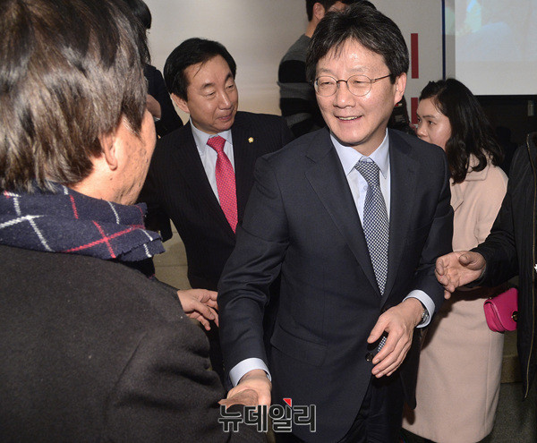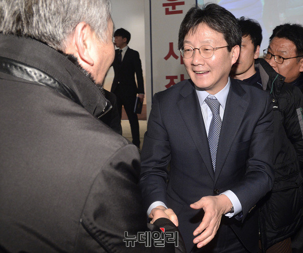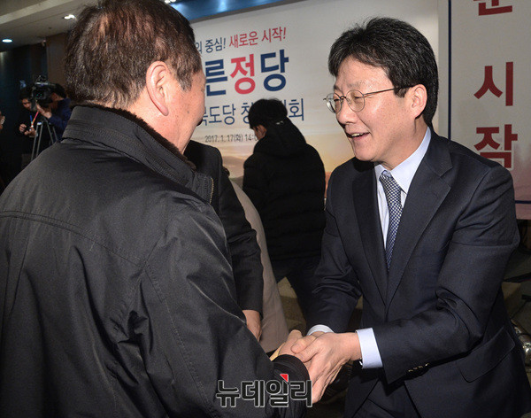 바른정당 유승민 의원이 17일 오후 전라북도 전주시 오펠리스 웨딩홀에서 '바른정당 전북도당 창당대회'에 참석해 지지자와 악수를 나누고 있다.
