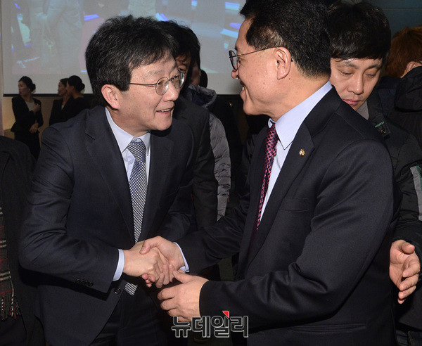 바른정당 유승민 의원과 정운천 전북도당위원장이17일 오후 전라북도 전주시 오펠리스 웨딩홀에서 '바른정당 전북도당 창당대회'에 참석해 악수를 나누고 있다.