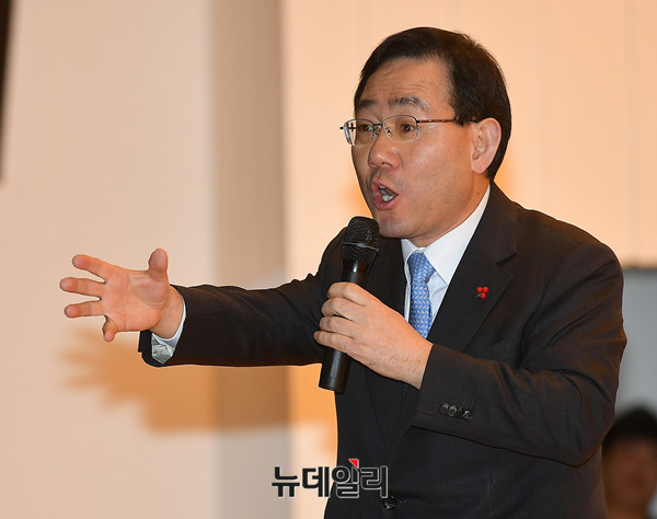 주호영 바른정당 원내대표가 18일 오전 대구 수성구 수성대학교 성요셉관에서 열린 바른정당 대구시당 창당대회에서 대구시당 위원장으로 선출된 직후 수락연설을 하고 있다. 주 원내대표는 이날 대구시당위원장에 선출됐다.