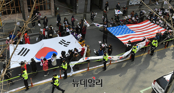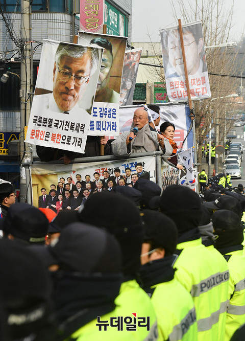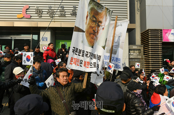 바른정당 대구시당 창당대회가 18일 오전 대구 수성구 수성대학교에서 개최된 가운데 입구에서 창당대회를 반대하는 집회가 열렸다. 이들은 문재인 전 더불어민주당 대표, 김무성 전 새누리당 대표, 유승민 의원등을 규탄하는 피켓을 들기도 했다.
