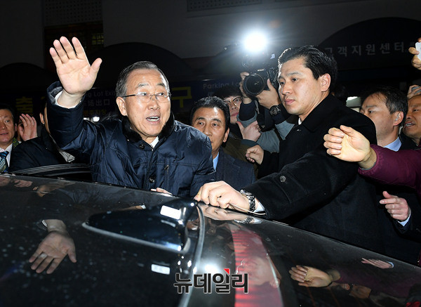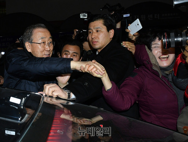 반기문 전 유엔사무총장이 18일 오후 대구 서문시장을 방문 후 떠나는 차에 오르기 직전 손을 건넨 시민과 악수를 나누고 있다. 서문시장에는 반 전 총장의 방문 소식에 많은 시민들이 몰려 인산인해를 이뤘다. 이날 오전 반 전 총장은 광주 5.18묘역과 조선대학교를 방문했다. (대구=뉴데일리 정상윤 기자)