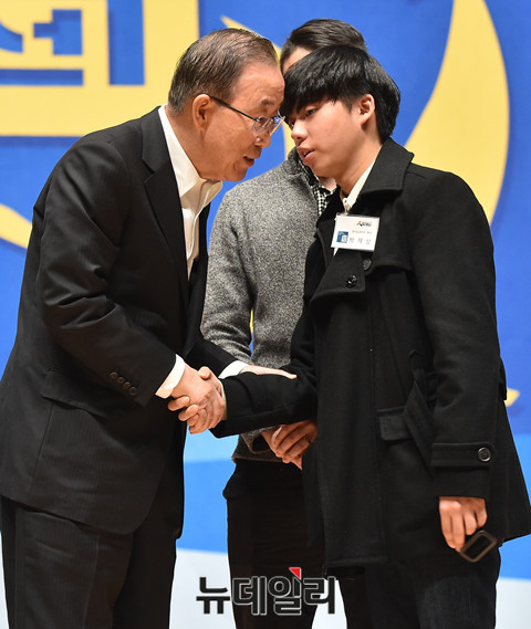 반기문 전 유엔 사무총장이 18일 오전 광주 동구 조선대학교 해오름관에서 '청년과 대한민국의 미래'라는 주제로 강연한 후 학생들과 인사하고 있다. (광주=뉴데일리 이종현 기자)