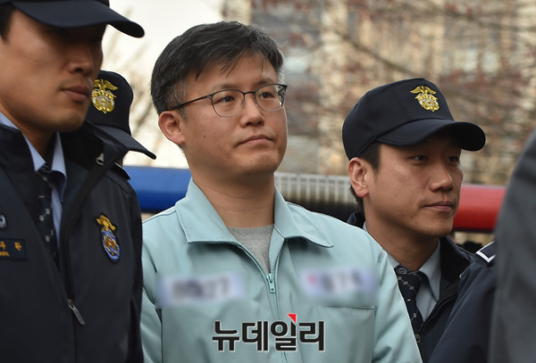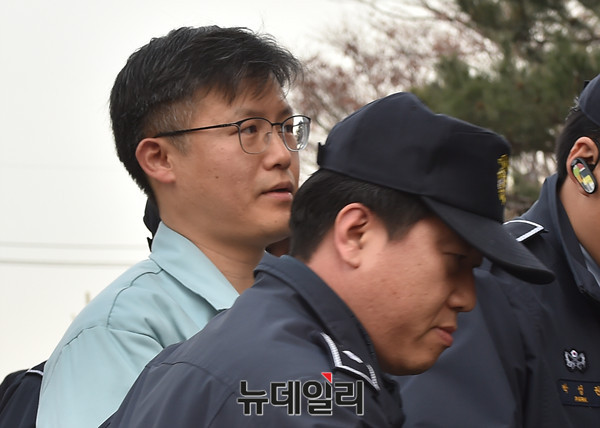 정호성 전 청와대 부속비서관이 19일 오후 서울 종로구 헌법재판소 대심판정에서 열린 탄핵심판 7차 변론기일 증인으로 출석하고 있다.