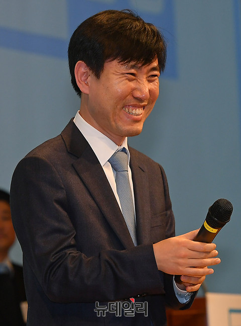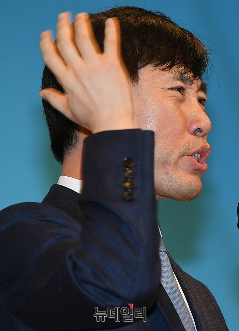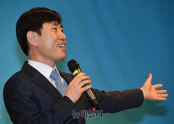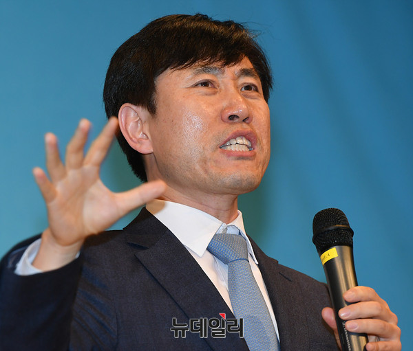 하태경 바른정당 의원이 18일 오후 부산 동구 부산국제여객터미널에서 열린 바른정당 부산광역시당 창당대회에서 발언을 하고 있다. 이날 창당대회에서 장제원 의원이 부산시당위원장으로 선출됐다.
