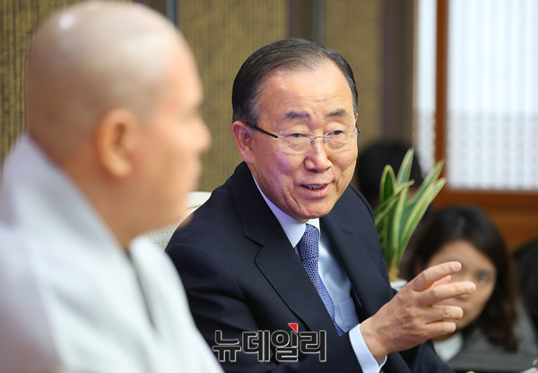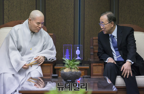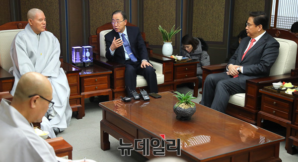 반기문 전 유엔 사무총장이 20일 오전 서울 종로구 조계사에서 자승 조계종 총무원장 스님을 예방을 하고 있다.