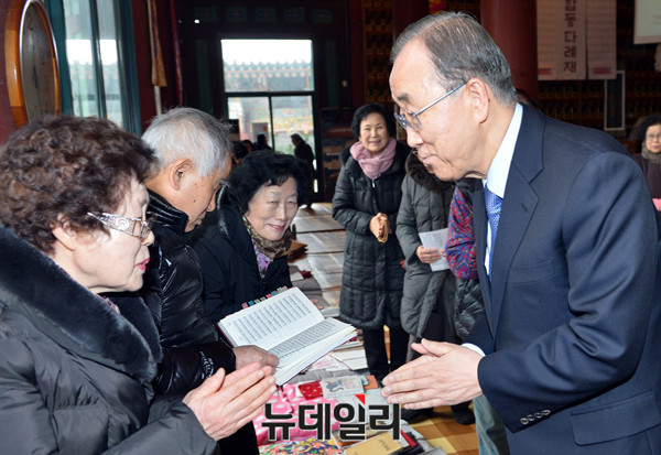반기문 전 유엔 사무총장이 20일 오전 서울 종로구 조계사 대웅전에서 예불을 마치고 신도들가 인사를 나누고 있다.