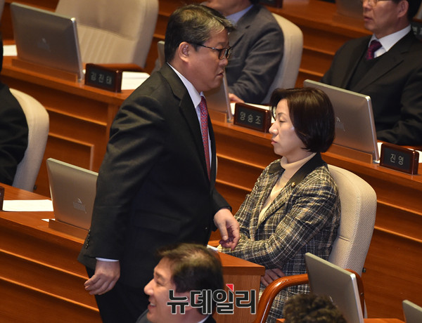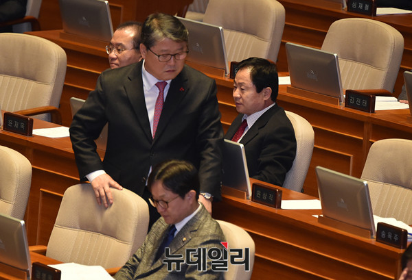 새누리당 조원진 의원이20일 오후 국회에서 열린 본회의에서 '중고등학교 역사교과서의 국정화 추진 중단 및 폐기 촉구 결의안'이 통과되자 불만을 표시하며 자리를 떠나고 있다.