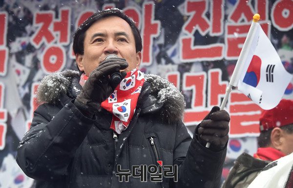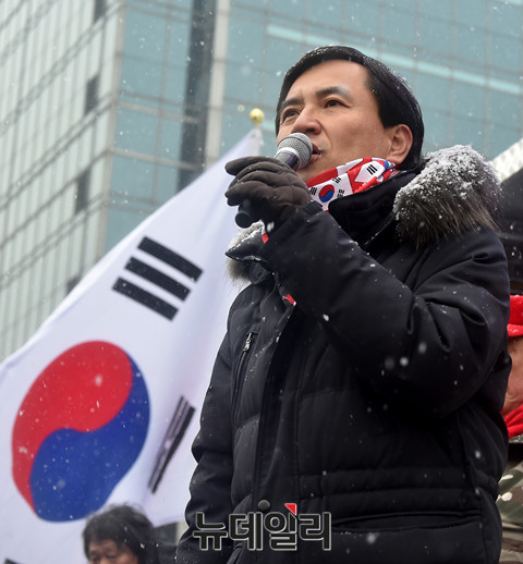 새누리당 김진태 의원이 21일 오후 서울 중구 덕수궁 대한문 앞에서 열린 '탄핵기각을 위한 국민총궐기 운동본부(탄기국)' 주최로 열린 태극기 집회에 참석해 발언을 하고 있다.