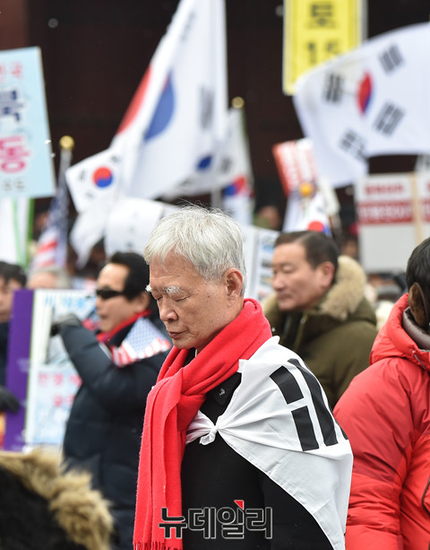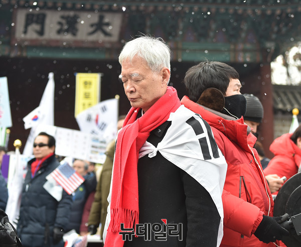 박근혜 대통령 변호인단 서석구 변호사가 21일 오후 서울 중구 덕수궁 대한문 앞에서 열린 '탄핵기각을 위한 국민총궐기 운동본부(탄기국)' 주최로 열린 태극기 집회에 참석해 묵념을 하고 있다.