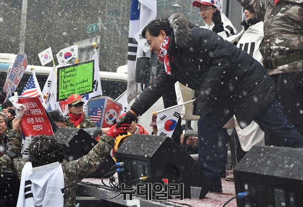 새누리당 김진태 의원이 21일 오후 서울 중구 덕수궁 대한문 앞에서 열린 '탄핵기각을 위한 국민총궐기 운동본부(탄기국)' 주최로 열린 태극기 집회에서 참석자들과 인사를 나누고 있다.