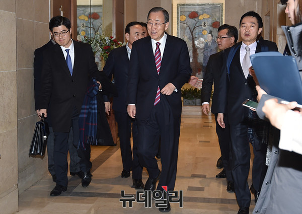 반기문 전 유엔 사무총장이 23일 오전 서울 마포 가든호텔에서 새누리당 초재선 의원들과 회동을 가진 후 기자들의 질문에 답하고 있다.