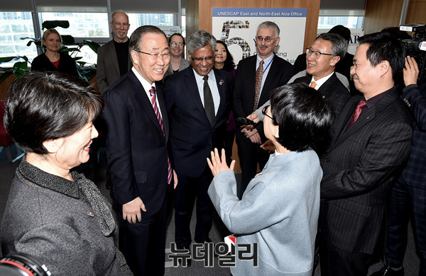 반기문 전 유엔사무총장이 23일 오후 인천 연수구 송도동 유엔에스캅 UNESCAP (아시아태평양 경제사회위원회) 동북아사무소를 비공개로 찾아 직원들의 환대를 받고 있다.