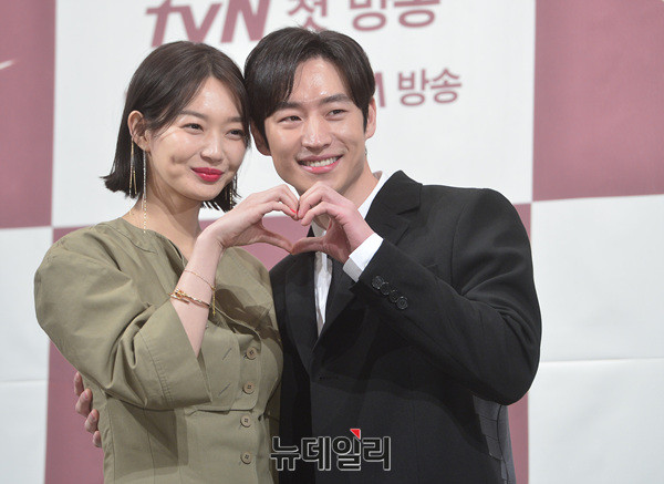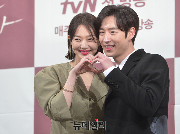 tvN 드라마 '내일그대와'의 신민아, 이제훈이 23일 오후 서울 강남구 임피리얼팰리스호텔에서 열린'내일그대와' 제작발표회에 참석해 포즈를 취하고 있다.