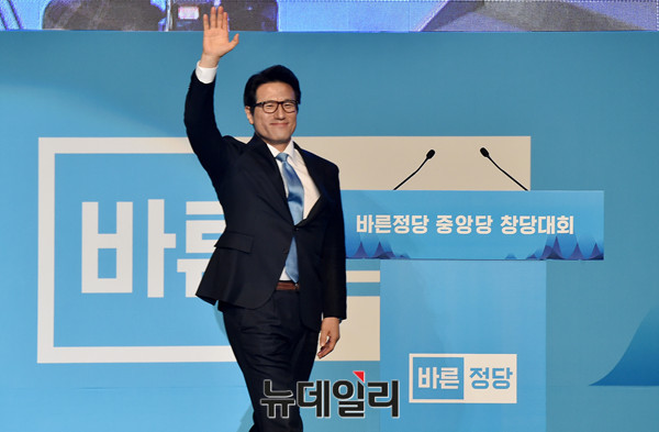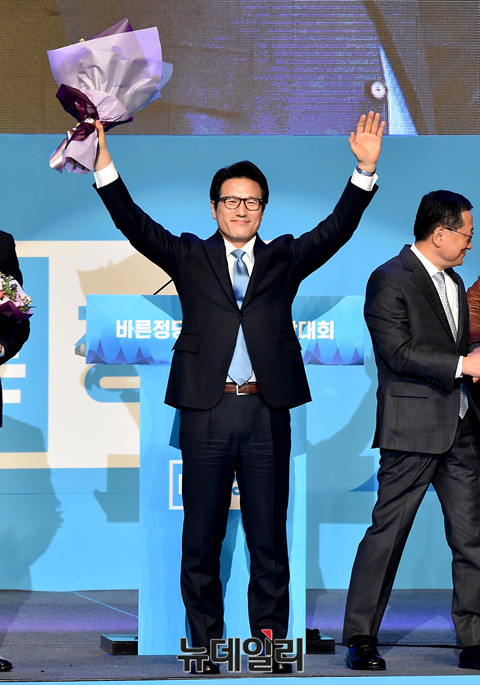 정병국 바른정당 창당준비위원장이 24일 오후 서울 송파구 올림픽 홀에서 열린 중앙당 창당대회에서 당 대표로 선출된 후 당원들에게 손을 들어 인사하고 있다.
