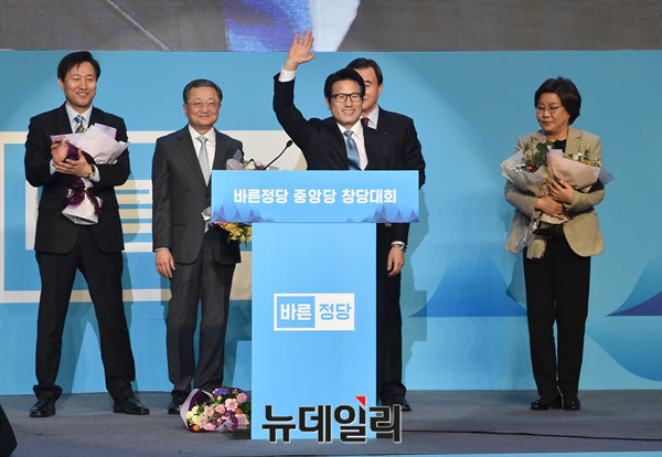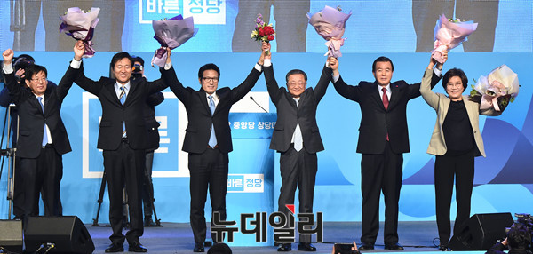 정병국 바른정당 초대 대표와 지도부가 24일 오후 서울 송파구 올림픽 홀에서 열린 중앙당 창당대회에서 당 대표로 선출된 후 당원들에게 손을 들어 인사하고 있다.
