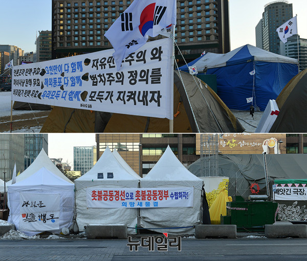 24일 오후 비슷한 시각 태극기텐트촌(위)과 세월호천막(아래)에 내걸린 현수막. 대통령탄핵기각을위한국문총궐기운동본부(탄기국)의 서울광장 태극기 텐트촌에 건 현수막의 내용은 "우리모두 다 함께, 자유민주주의와 법치주의 정의를 모두가 지켜내자"다. 광화문 광장에 3년째 점거중인 세월호 천막에는 "촛불공동경선으로 촛불공동정부 수립하자!"는 내용의 현수막이 걸려있다.