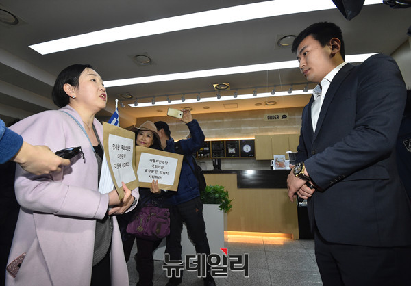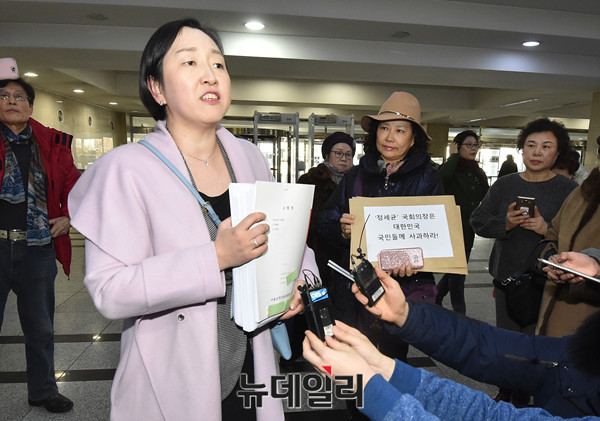인지연 북한동포와 통일을 위한모임 Nank 대표가 25일 오후 국회 민원실을 찾아 박근혜 대통령 누드화 국회 전시를 주최한 표창원 의원의 대한민국 국회의원직 사퇴를 요구하고 항의서한을 정세균 국회의장실과 추미애 더불어민주당 대표실 관계자에게 전달하고 있다.