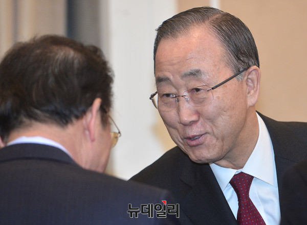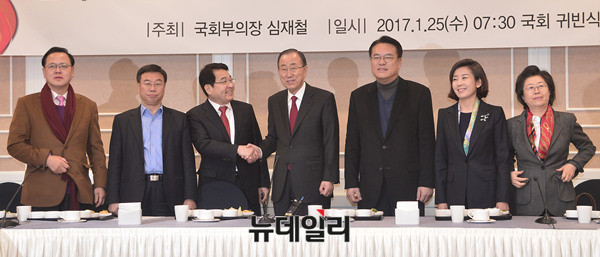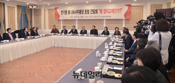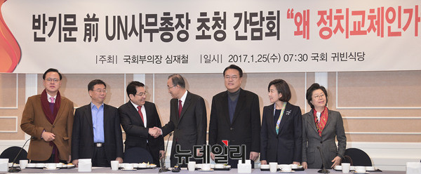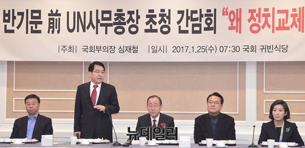 심재철 국회부의장의 주최로 25일 오전 국회 귀빈식당에서 반기문 전 유엔사무총장 초청 '왜 정치교체인가?' 조찬 간담회가 열렸다. 이날 간담회에는 반기문 전 유엔사무총장, 새누리당 정진석 전 원내대표, 나경원 의원 등이 참석했다.