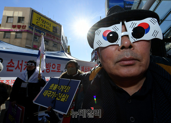대구 태극기집회에 참가한 한 참가자가 26일 오후 대구 동성로 대구백화점 앞에서 태극기로 만든 안경을 쓰고 집회에 참석했다. 이날 대구 태극기집회에는 권영해 탄기국 공동대표, 정광용 대변인, 김진태 새누리당 의원, 정미홍 전 KBS아나운서, 박성현 뉴데일리주필 등이 연사로 나설 예정이다. (대구=뉴데일리 정상윤 기자)