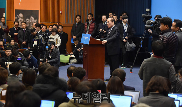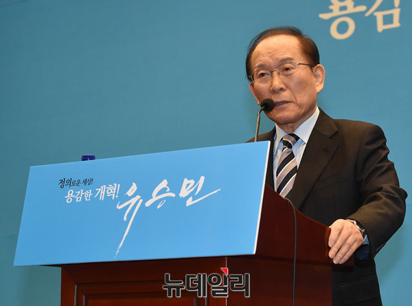 이회창 전 한나라당 총재가 26일 오전 국회 헌정기념관에서 열린 바른정당 유승민 의원 대선출마 기자회견에 참석해 축사를 하고 있다.