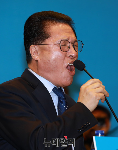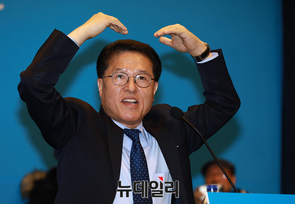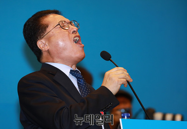 바른정당 정운천 의원이 26일 오전 국회 헌정기념관에서 열린 유승민 의원 대선출마 기자회견에 참석해 축사를 하는 중 "꼬끼오"를 외치고 있다.