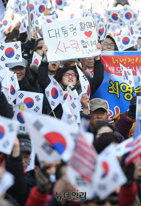 태극기집회에 참가한 한 어린이 참가자가 26일 오후 대구 동성로 대구백화점 앞에서 열린 집회에서 "대통령할머니 사랑합니다"라고 손으로 쓴 피켓을 들고 환호하고 있다.