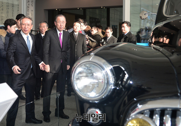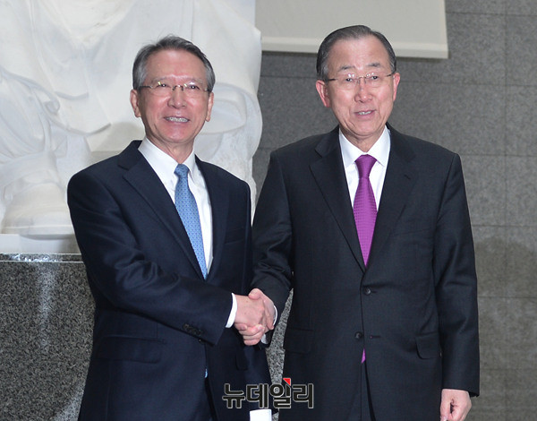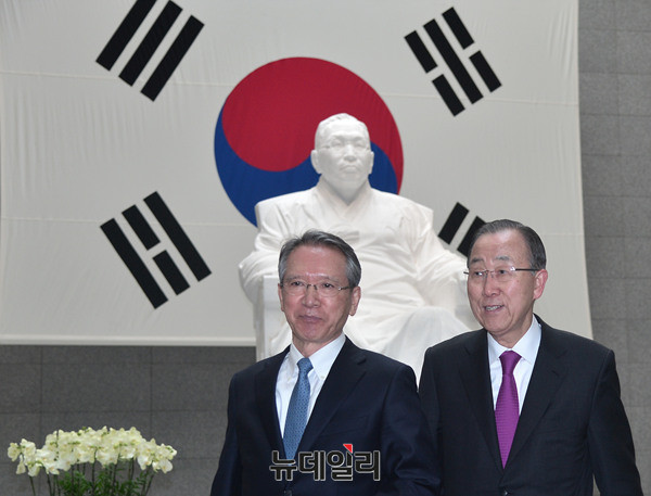 반기문 전 유엔사무총장이 26일 오전 서울 백범기념관을 방문해 백범기념사업회장인 김형오 전 국회의장과 악수를 나누고 있다.