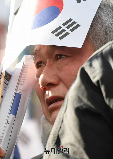 태극기 집회에 참석한 한 시민이 26일 오후 대구 동성로 대구백화점 앞에서 열린 대구 태극기집회에서 한 손에 태극기를 들고, 연설을 들으며 눈시울을 붉히고 있다. 이날 대구 태극기집회에는 권영해 탄기국 공동대표, 정광용 대변인, 김진태 새누리당 의원, 정미홍 전 KBS아나운서, 박성현 뉴데일리주필 등이 연사로 나설 예정이다. (대구=뉴데일리 정상윤 기자)