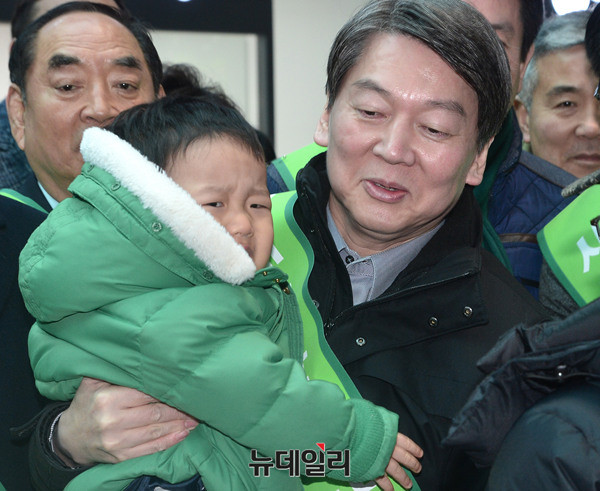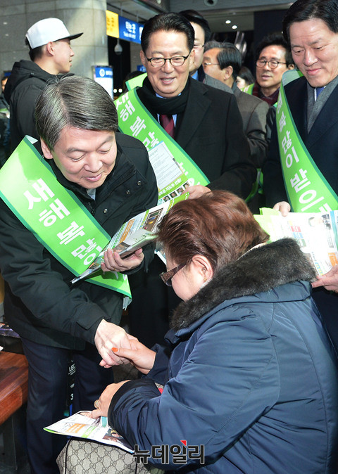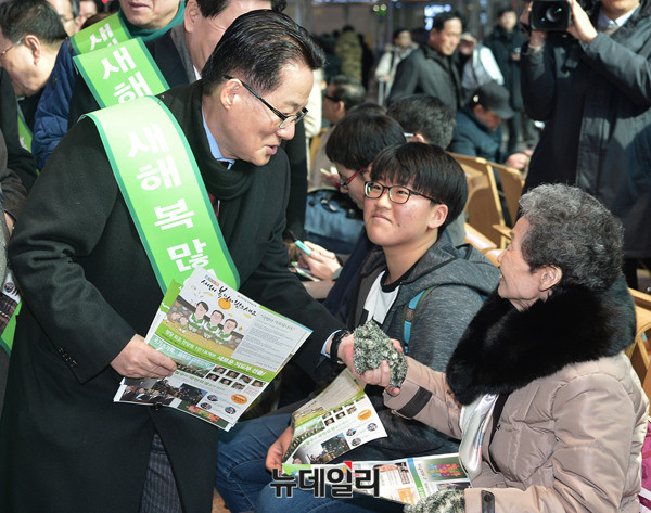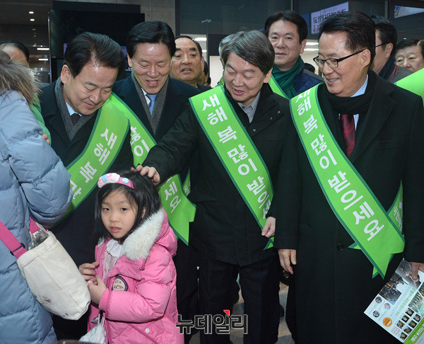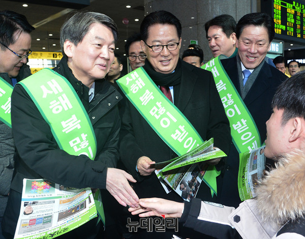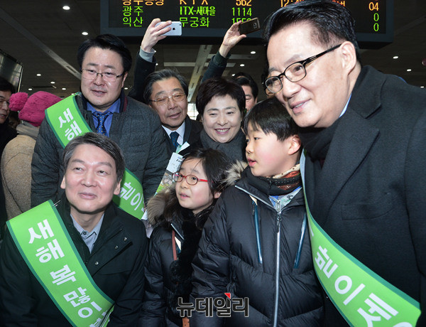 국민의당 박지원 대표를 비롯한 지도부가 26일 오후 용산역을 방문해 귀성객과 함께 사진을 찍고 있다.